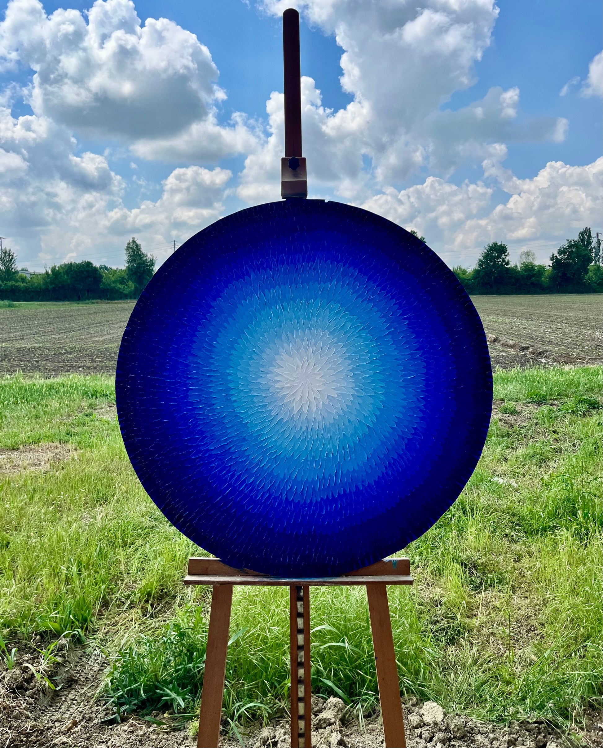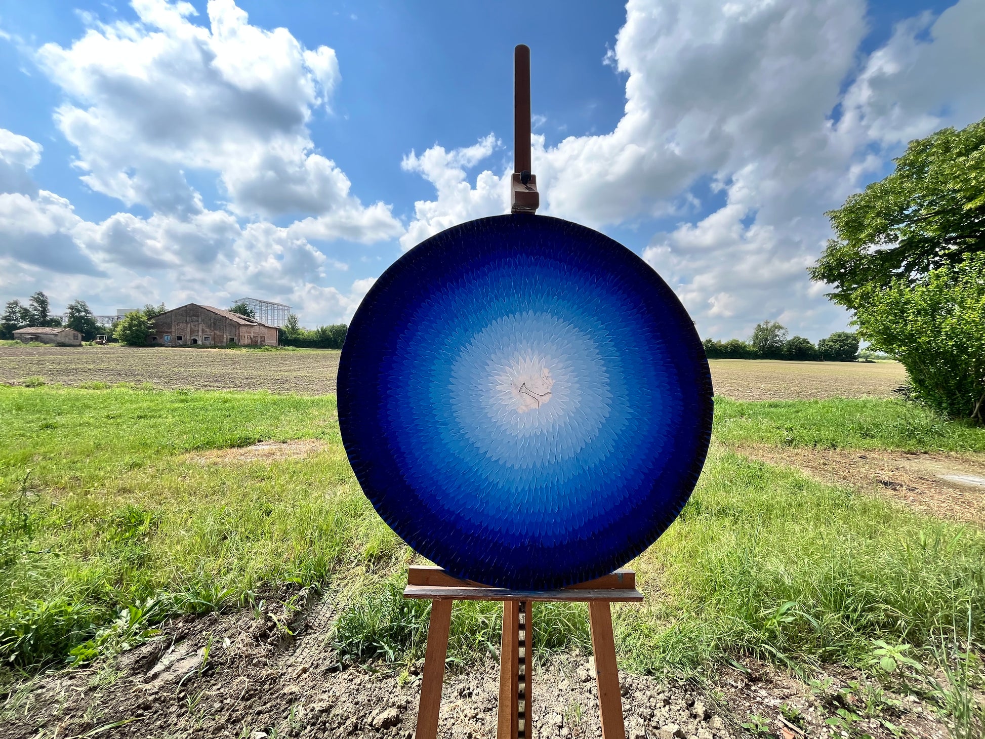Dipinto ad olio su legno. Di forma tonda sulle tonalità del Blu di Prussia al bianco